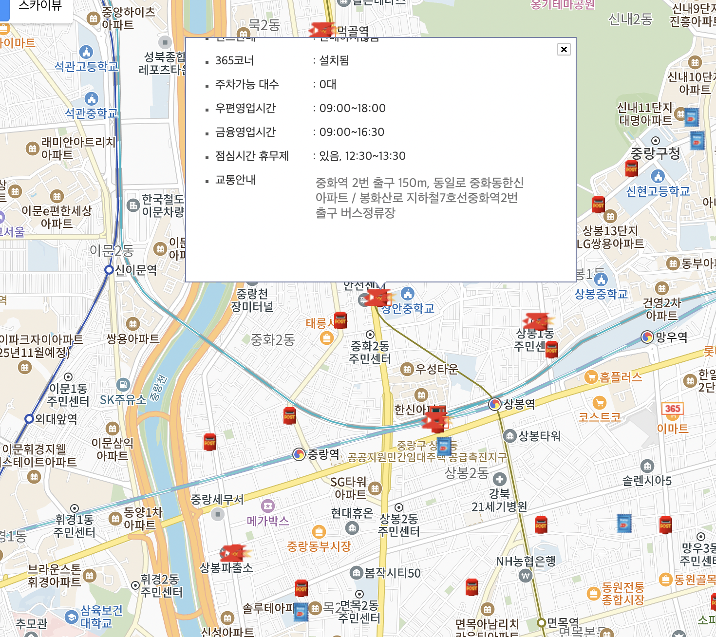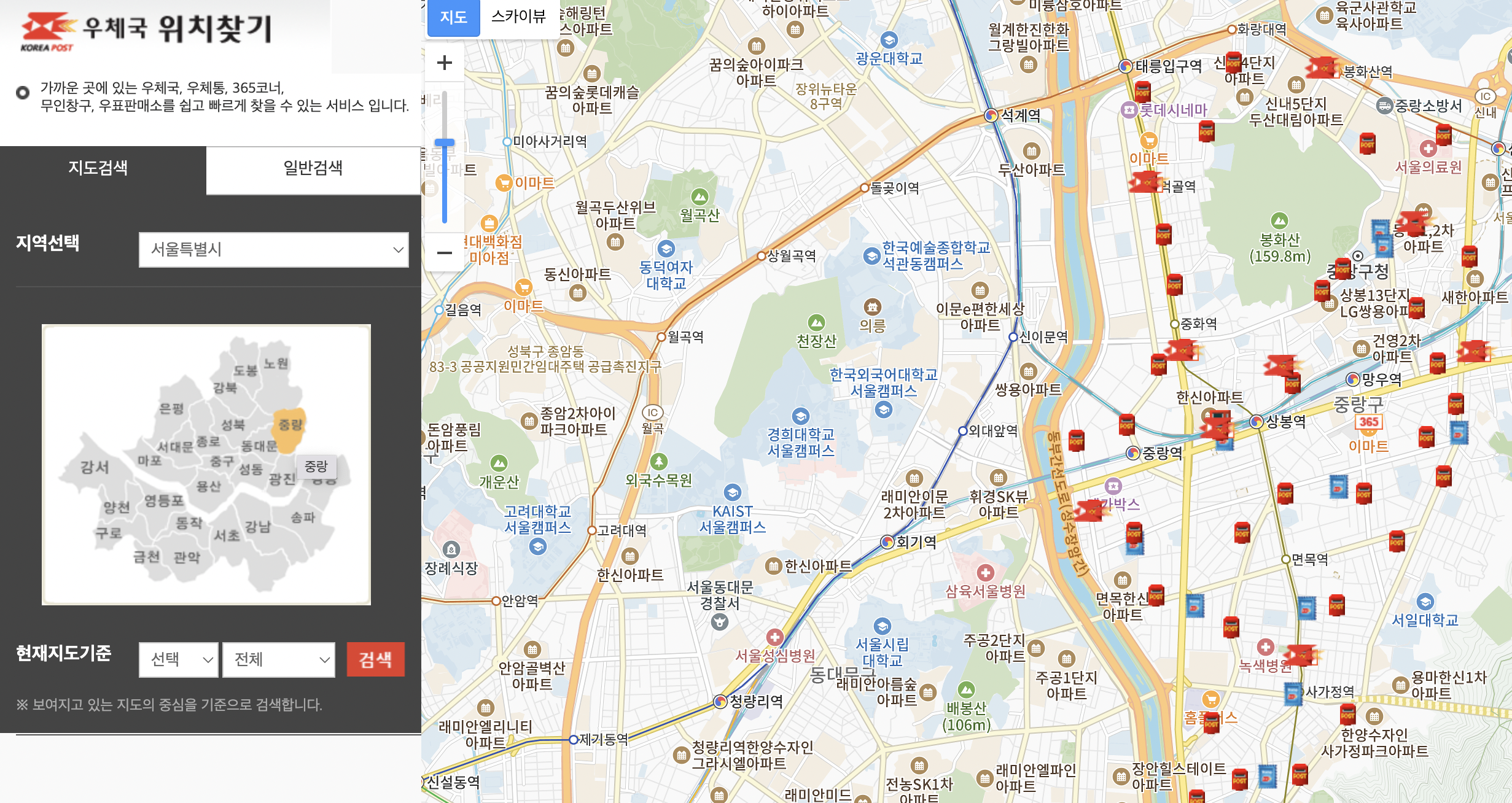 중랑구 안의 우체국 위치들이 지도에 표시됐습니다.